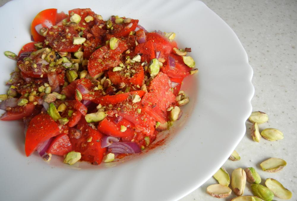 Помидоры, болгарский перец, лук, фисташки, масло растительное.
