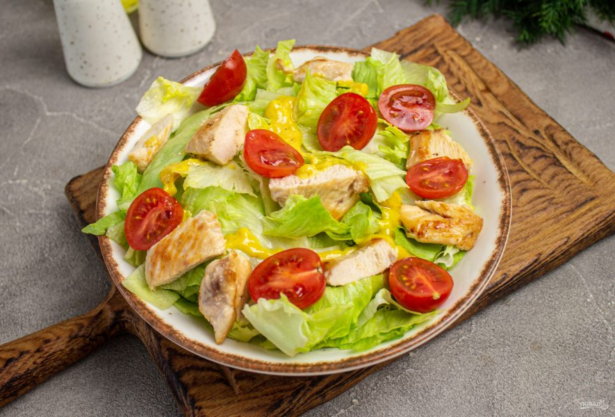 Помидоры, зеленый салат, куриное филе, соус "Цезарь", сыр пармезан, сухарики, сливочное масло.