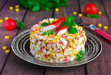 Крабовые палочки, огурец свежий, яйцо, кукуруза, зелень, майонез.