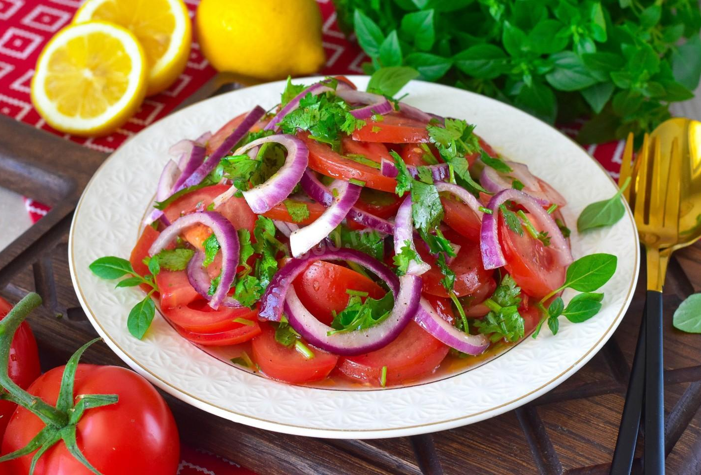 Помидоры, маслины, лимон, лук зеленый, масло оливковое, зелень.