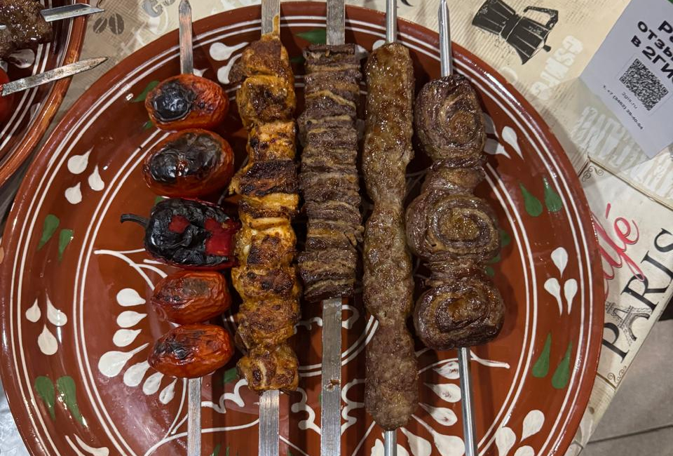 Помидор на мангале. Куриный шашлык. Говядина. Люля баранина. Рулет рохат.